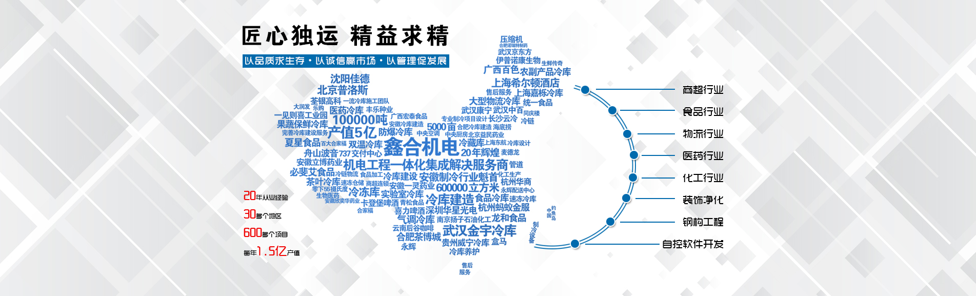 安徽鑫合機(jī)電設(shè)備有限公司于2002年組建運(yùn)營,專業(yè)從事冷凍、冷藏庫、中央空調(diào)、醫(yī)藥凈化工程的規(guī)劃設(shè)計、施工承建、售后服務(wù)為一體的綜合性工程公司,與100多家實(shí)力雄厚的大中型企業(yè)建立長期產(chǎn)略合作關(guān)系,其中有多家世界500強(qiáng)和上市企業(yè)。公司作為中國倉儲與配送協(xié)會會員單位、安徽省制冷學(xué)會理事單位、上海楊浦區(qū)制冷協(xié)會工程總承包負(fù)責(zé)單位,引領(lǐng)于行業(yè)前沿。我們將銘記給予我們大力支持的各界新老朋友及合作伙伴,我們將會保持“互惠互利、共同發(fā)展”的原則與您共創(chuàng)雙嬴的合作關(guān)系。